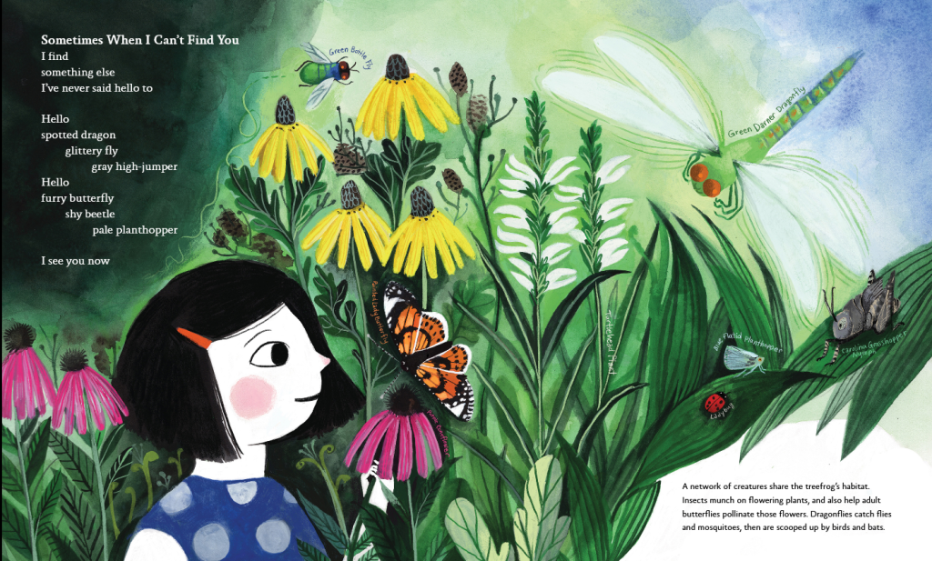In short, Dear Treefrog is a picture book written by poet Joyce Sidman about the titular creature discovered in a girl’s backyard. Dear Treefrog is also a lushly detailed watercolor wonderland illustrated by Diana Sudyka, who just might be my new favorite artist. It’s a meditation on transitions, loneliness, and making a new home as seen through the eyes of an elementary-aged child who, though never named, is a full character of her own. It’s also a celebration of the sheer magic around us if we’re only willing to pause and meet nature on her own terms. And it’s about ecosystems, mindfulness, social-emotional learning, and empathy building. Honestly, get you a book that can do it all.