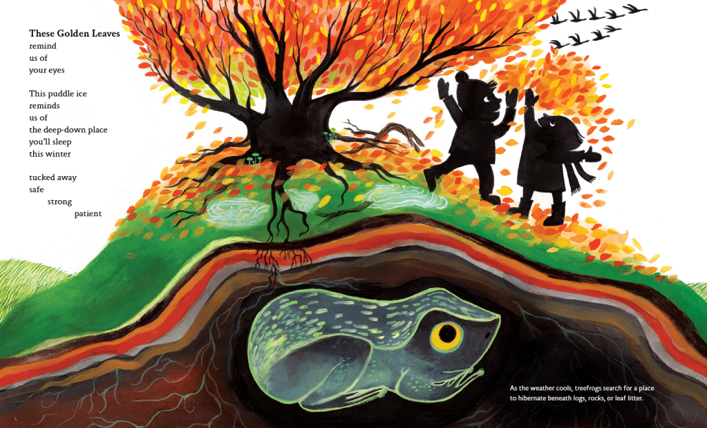 I’m not alone in loving this title, either. Betty Carter writing for Horn Book gave Dear Treefrog a starred review, calling it “altogether lovely.” Kirkus‘ review describes it as “a poignant, poetic journey.” Sarah Hunter writing for Booklist also gives a starred review that praises Dear Treefrog for “seamlessly blend[ing] science, poetry, and mindfulness.”